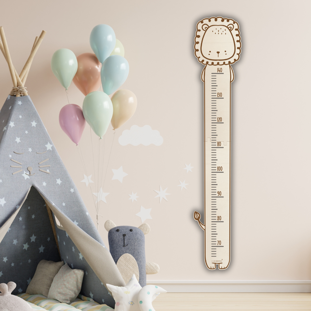 Vores løve-højdemåler er skabt i lyst naturtræ (3–4 mm) og graveret med fine detaljer, der giver et varmt og naturligt udtryk.