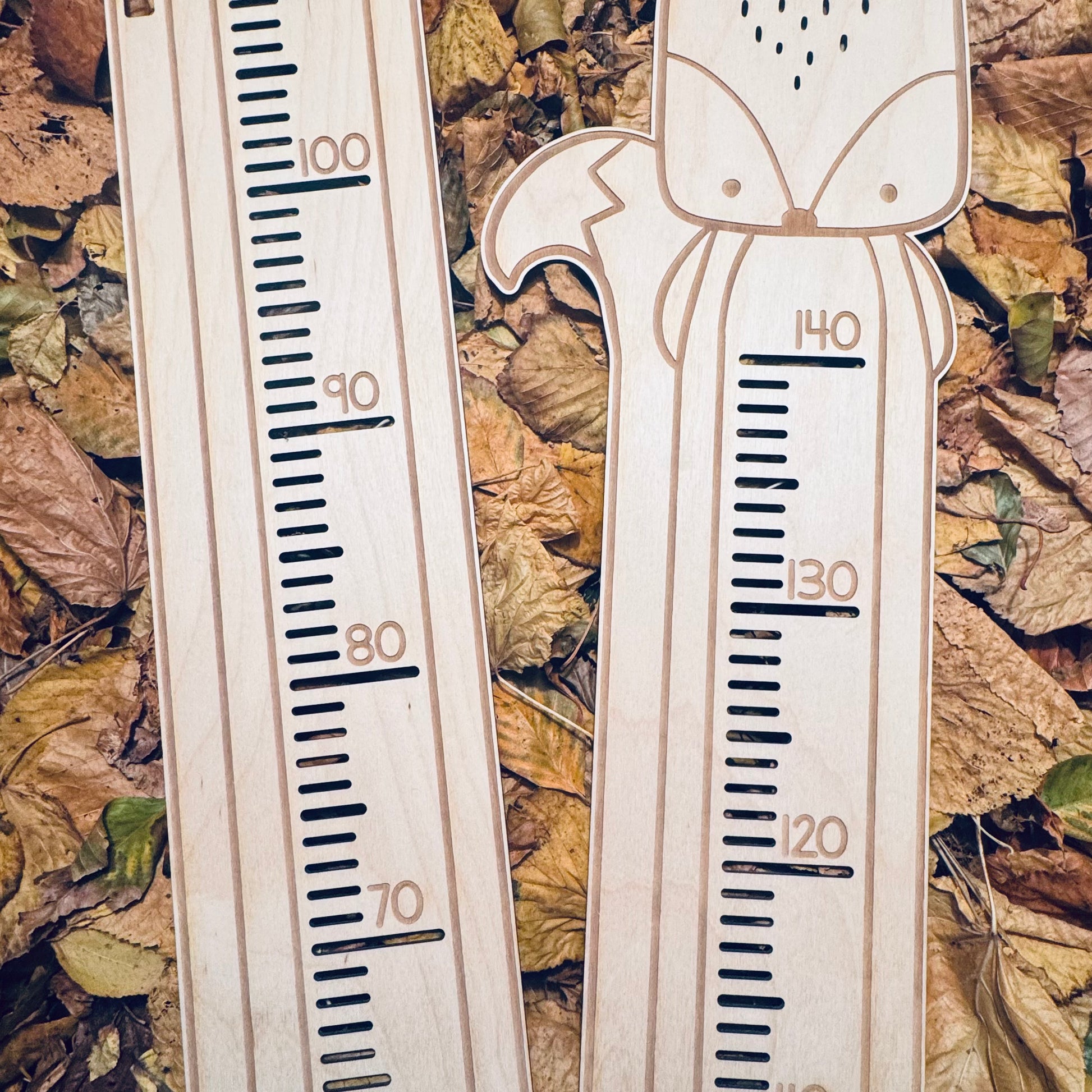 Vores ræve-højdemåler er lavet i lyst, naturligt træ med fine, graverede detaljer, der giver et roligt og tidløst udtryk til børneværelset.