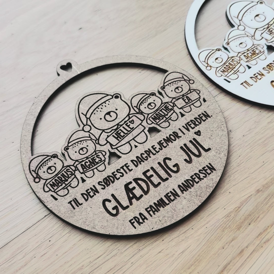 Personlig julekugle i træ til dagplejemor – byg selv din kærlige hilsen